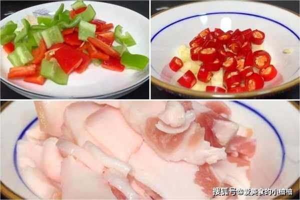 5.青红椒切块,大蒜切蒜末,小米辣切圈,五花肉切薄片。