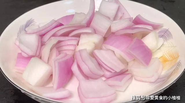 4.洋葱切成小方块,用手掰散开,放入盘中备用。