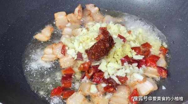 7.五花肉炒至微微发黄,倒入蒜末小米辣煸香。
