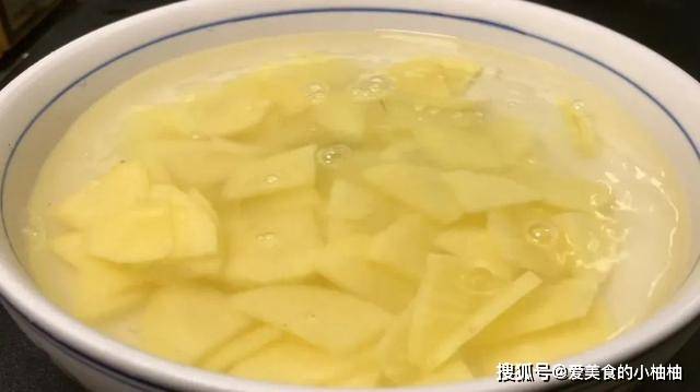3.切好的土豆片放入大碗中,加入适量清水,再滴几滴白醋,放置一旁浸泡,防止氧化变黑。