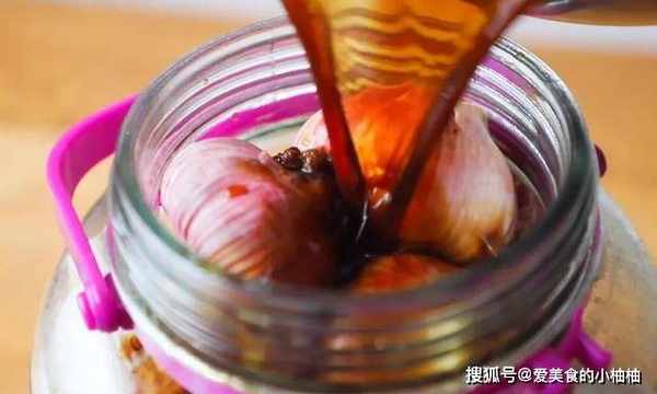 7.准备一个无水无油的坛子,放入泡好的大蒜,再倒入放凉的料汁。
