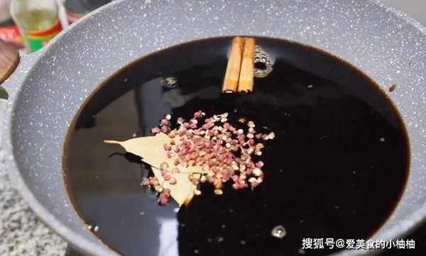 5.再加3片香叶,2块桂皮,一小把花椒,开大火煮开,一边煮一边搅拌,使调料完全融化。