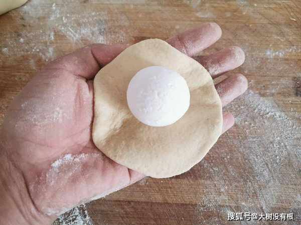 3、接下来我们拿来一个剂子,反复往里揉捏,再擀成中间厚四周薄的圆片,包入一个汤圆,我用的是黑芝麻汤圆,你也可以用其他口味的,像包包子一样把口收起来,之后整理好。