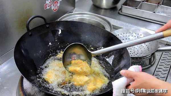 5.锅内烧油,油温五成热时,放入鸡翅,开中火炸三分钟,炸的过程中有漂浮淀粉渣,用勺子捞干净,炸到鸡翅两面金黄倒出控干油。
