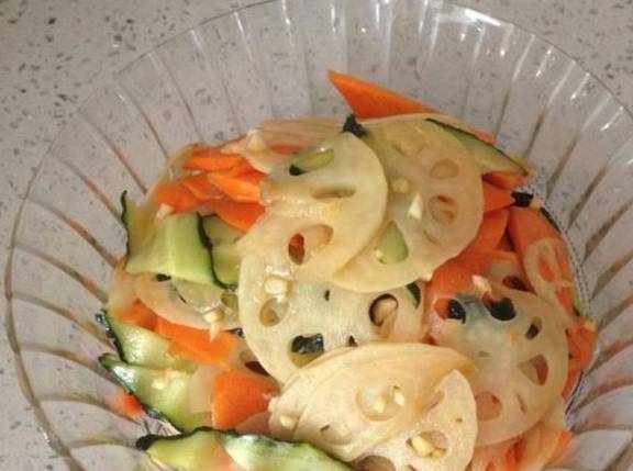 做法:莲藕洗净,去表皮,切薄片,浸泡在清水中备用滴几滴醋,莲菜不会变黑,胡萝卜切薄片,可在其上切出合适大小的缺口,既美观又便于用筷子食用,大葱、姜和尖椒均切为细沫状,备用;锅内倒入水,烧开后将莲菜和胡萝卜放入,轻煮至胡萝卜熟后捞出,沥干水;黄瓜切薄片后与莲菜胡萝卜放一起,将切好的葱姜尖椒沫放在准备好的菜上面,热锅里烧油至熟,泼在葱姜尖椒沫上。接着放盐、鸡精、一点香油、搅拌即可,一盘兼备色香味的凉拌莲菜就好啦