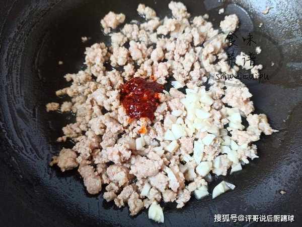 2、起锅烧油,油热之后,下入肉末,炒至微微发黄后,加入蒜末,炒出蒜香味,再加1勺豆瓣酱,1勺料酒,翻炒均匀。