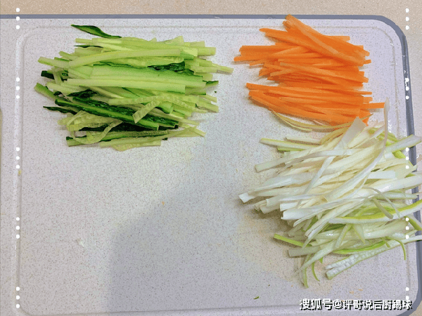 7、改刀切一些葱丝、黄瓜丝、胡萝卜丝、豆皮卷,按照个人的喜好,衬托在京酱肉丝的周围即可。