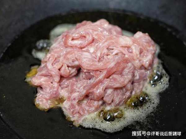 2、等时间到了,开始加热铁锅,这里要用热锅冷油的方式,该怎么操作呢?烧热铁锅,倒入凉油,马上倒入肉丝,稍等几秒钟以后,用铲子摊开,慢慢煸炒,因为肉丝有淀粉,不可用热锅热油,否则会粘锅。