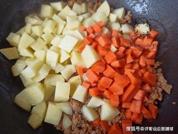3、等炒出红油后,下入土豆和胡萝卜,继续翻炒均匀,大约2分钟。