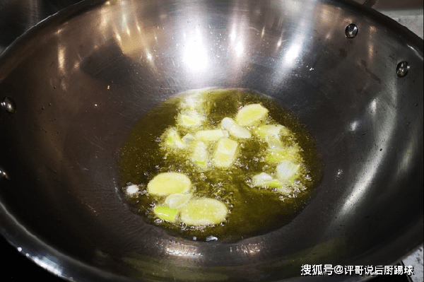 3、转成大火,准备好姜片和大葱,先放姜片,等20秒后再放大葱,爆出葱蒜味,再倒入虾仁。