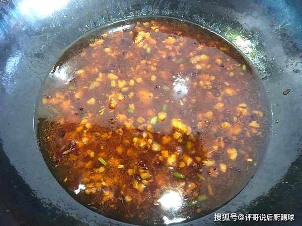 4、起锅烧油,开始烹饪,热锅凉油,等油三分热时转小火,放入约30颗花椒粒,慢慢煸炒出香味,并有颗粒感,微微发黑,即可捞出丢掉,先放入腌制好的肉馅,加入1勺豆瓣酱,炒出红油,倒入调好的料汁。
