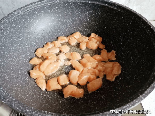 3、起锅烧油,油热倒入腌好的鸡胸肉,滑炒一会儿,一直炒至变色,鸡胸肉不要切大块,其实很容易就熟透了。
