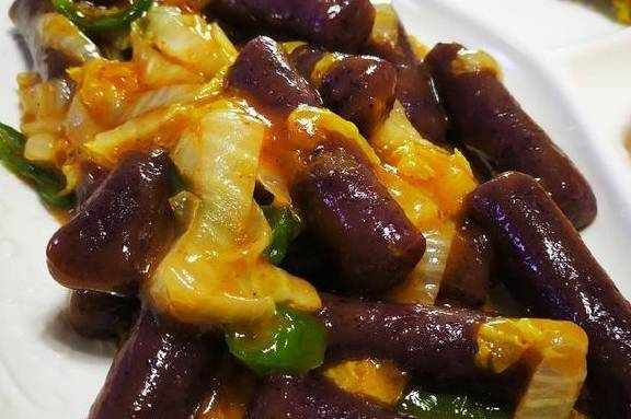 4、等年糕软糯后,加入少许盐,甜辣酱,翻炒均匀,即可出锅装盘。