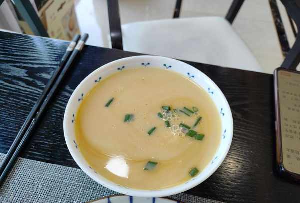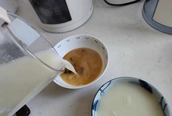 老公的碗里加点酱油和葱花,直接倒入热豆浆里。我不往碗里加任何东西。