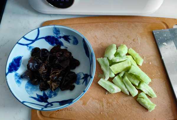 将黄瓜和黑蘑菇加入适量的醋、蚝油、糖、盐和五香粉拌匀。