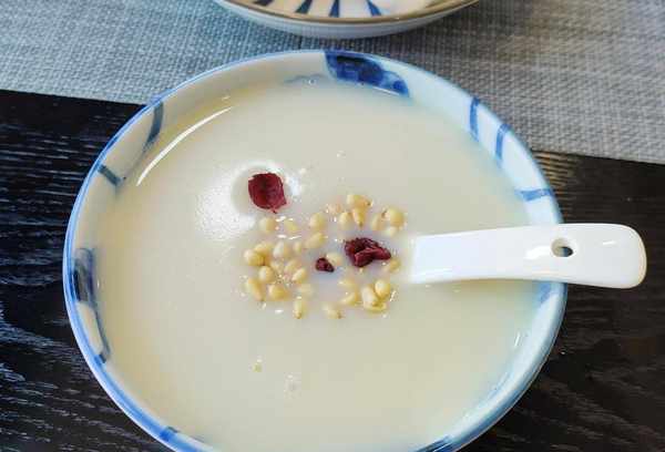 这款豆浆的成分不仅是大豆,还有燕麦芽的大米。我吃的时候加了松子和蔓越莓干,不加任何调味料。松子很香,蔓越莓干又酸又甜,口感丰富,营养翻倍。