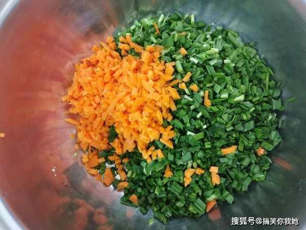 2、趁着醒面的时间,我们来准备馅料,韭菜洗净切成碎末,装入一个盆子中,胡萝卜洗净先切片,再切成小碎丁,和韭菜末放在一起。