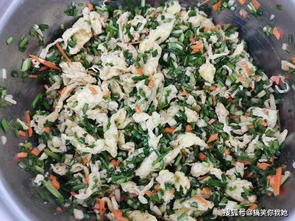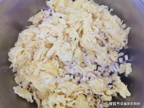 4、3个鸡蛋打碎,放入锅中炒熟,铲成小块,和馅料放在一起。