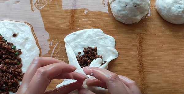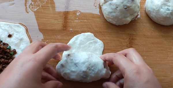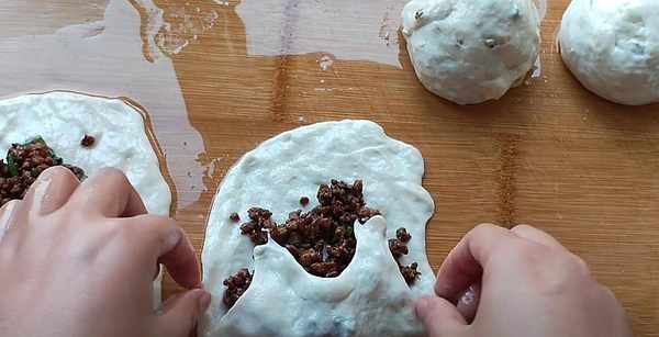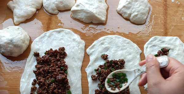 9.不用擀面了,直接用手推开即可。整理长长条状。在表面放上一把肉馅,整理均匀。