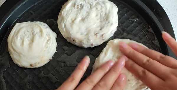 13.起锅倒油,油热下入生坯,用手稍微按扁。开小火慢慢烙。