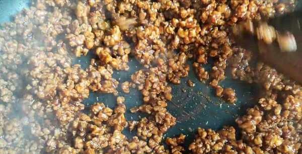 5.接着倒入前面调好的酱肉汁,开小火炖煮。多炒一会,把水分炒干一点,这样吃着才香。