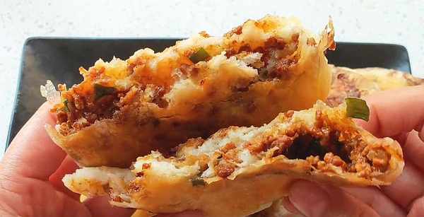 做法很简单,不用揉面也不用擀面。为了柔软加入大量清水,下手揉就太黏了,用一根筷子就能搞定。之后操作就用油辅助一下,制作起来还是很方便的。喜欢吃面食或者肉饼的朋友不要错过,做法简单味道香。皮薄馅大,吃着非常解馋。