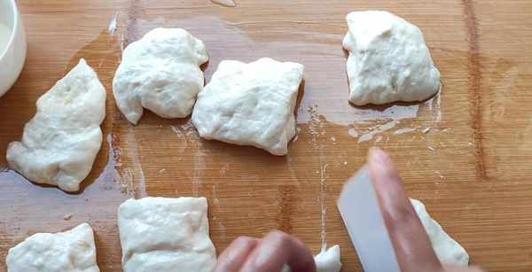 8.案板上也抹点油。把面糊移过来,整理成长条,再切分成小面剂子。