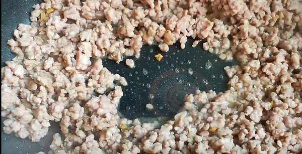4.起锅倒油,油热下入生姜末炒香,再下入猪肉炒至变色。