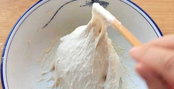 2.一直搅拌到面糊粘稠。多搅拌一会,搅拌到看不见干面粉,表面比较平滑的状态。盖上盖子发酵到两倍大。