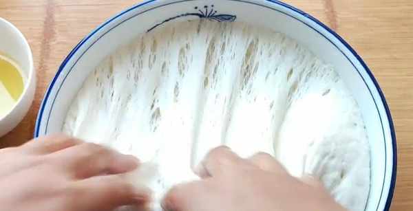 7.发酵好的面糊体积变大,表面非常多气孔,手上抹点油防粘,把它扒拉下来。
