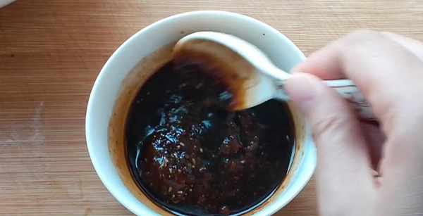 3.做个酱肉汁。碗中加入30克左右的黄豆酱,再调入2勺生抽,一勺老抽,少许鸡精,少许白糖,搅拌均匀备用。