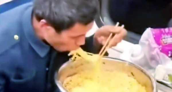 大哥自我调侃式的介绍,瞬间把整个车厢的人逗得哈哈大笑。随后,大哥就开始大口朵颐地吃了起来,虽然方便面不是什么好东西,但大哥的满足感以及他吃得那么香,就算是隔着屏幕也要流口水了。