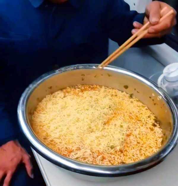 你以为大哥这是大材小用吗?他接下来的举动更是直接颠覆了大家的想象,竟然一次直接泡了10袋方便面,泡好之后足足有大半盆。大哥瞬间成为了整个车厢最靓的仔,大家纷纷凑过来围观,还有人记录下了这一罕见的场面。