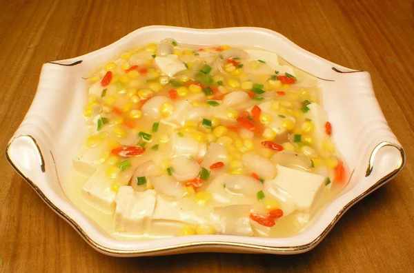 辣椒200g、玉米200g、嫩豆腐300g、宴友食用油适量、蒜适量、生抽适量、水淀粉适量、盐适量