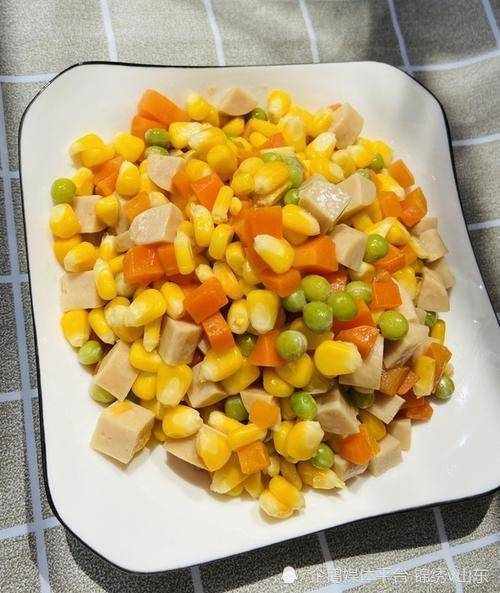 做法:1、胡萝卜去皮洗净后切成小丁,火腿切成小丁;甜玉米,青豆洗净备用;