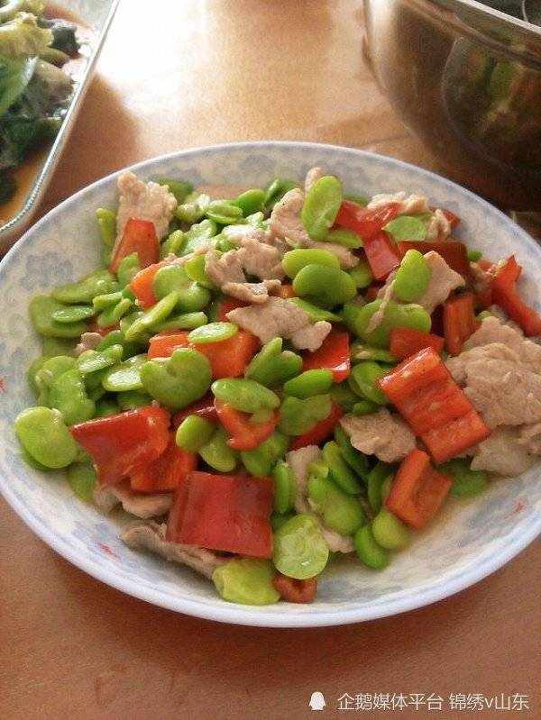 ⑤最后倒入蚕豆、盐,炒到蚕豆熟透。再倒入少许淀粉水勾薄芡,这道菜就做好了。