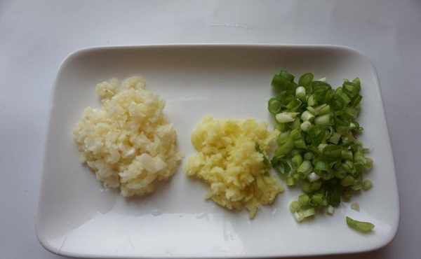 4、在盛有蛏子肉的锅中加入适量料酒和酱油,将蛏子腌好;将大葱和蒜瓣分别洗净,切葱花和蒜末;