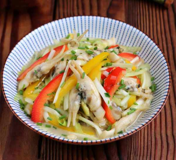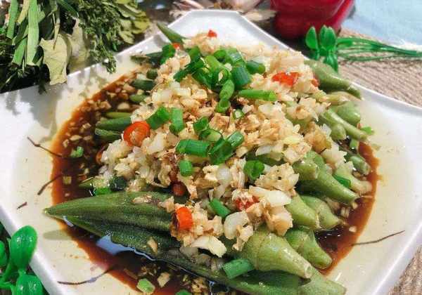 材料:秋葵、蛏子、桃园健民西瓜酱、葱花、蒜瓣、酱油、糖、醋、胡椒粉、盐