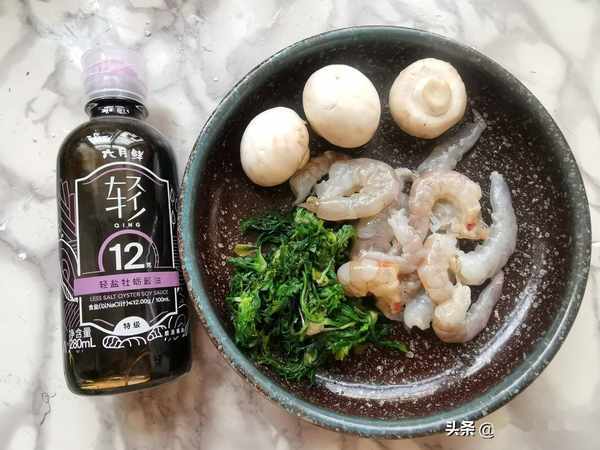 第四步:荠菜烫一下备用,大虾去皮成虾仁,口菇洗净,六月鲜12克牡蛎酱油备用。