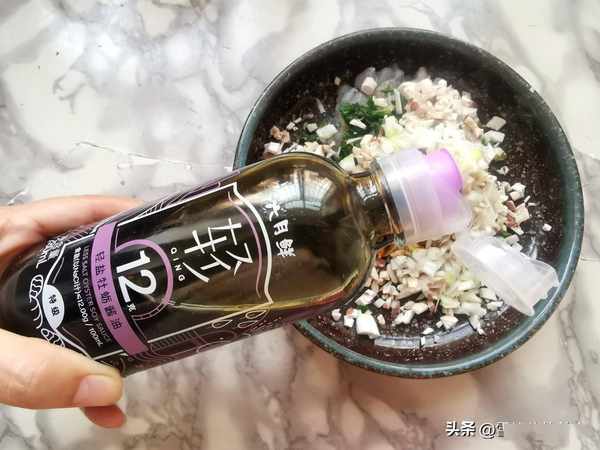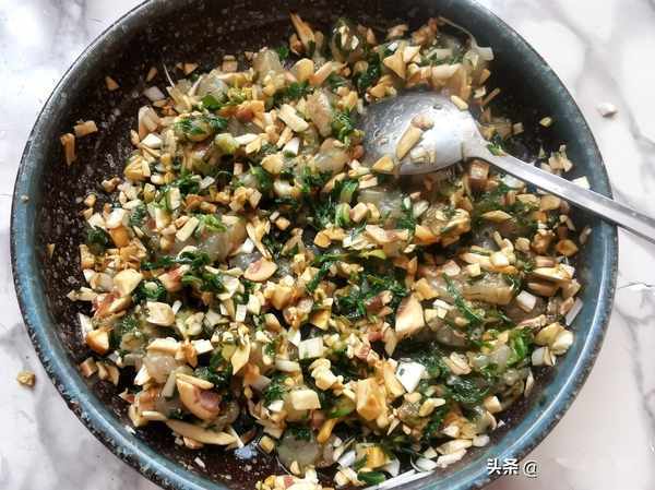 第五步:把虾仁切丁,荠菜切碎,口菇切成碎末,葱切末一起放入盘中,加入六月鲜12克牡蛎酱油提味,不需要再放盐。