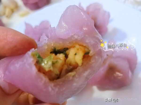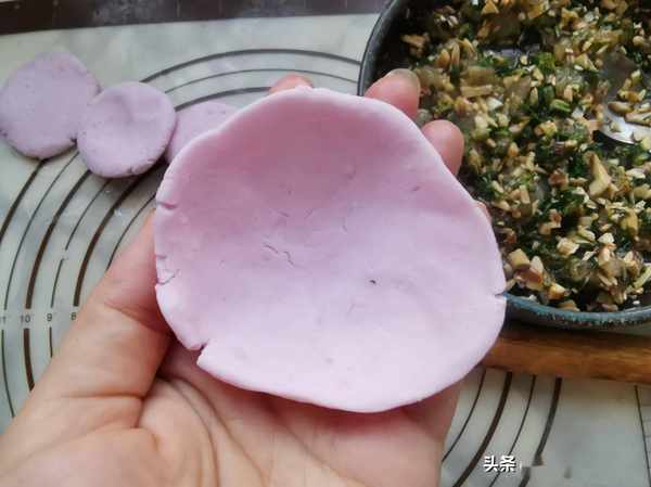 所用材料:面团:紫甘蓝少许,柠檬汁少许,澄粉120克,土豆淀粉120克,花生油少许,紫甘蓝汁少许。馅料:荠菜少许,虾仁适量,口菇3个,六月鲜12克轻盐牡蛎酱油少许,葱末少许,姜末少许,花生油少许。