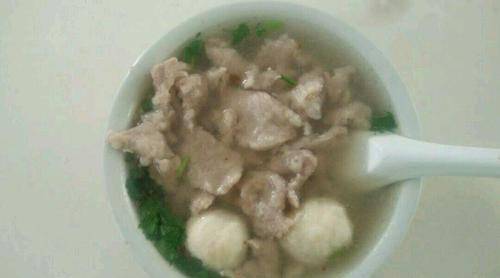 将用淀粉搅拌好的肉片往烧开的水中倒去,这样煮上十分钟左右,然后就可以将豆丸倒入。