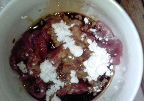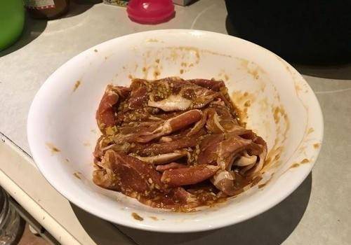 大家把切好的肉片放入拌有盐、糖、味精、酱油的盘中腌制,等到入味后再取出。