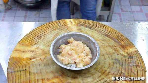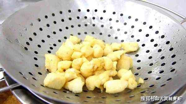 4.下面,我们把鸡肉丁快速滑一下油,锅内烧油,油烧至5成热,把鸡肉丁倒入锅内,这个时候要用中火,有粘连的鸡肉,用勺子轻轻打散,炸1分钟左右,炸至鸡肉微黄,就可以倒出控油。