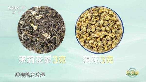 取茉莉花茶3克、菊花3克,然后倒入150毫升的热水(水温约为80℃~90℃),闷泡5分钟即可饮用。