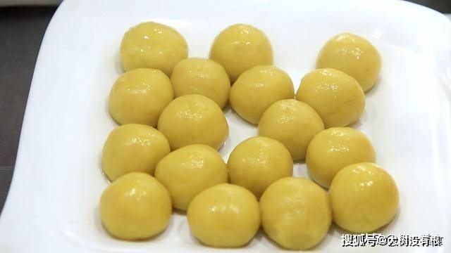 用手团成红薯团,这个面团比较松散, 不需要揉搓,团成一个红薯面团就可以了,和好以后 ,用手揪下一个小面剂子, 用手心揉成小圆球,揉成大小均匀的小圆球以后 ,全部放在盘中。