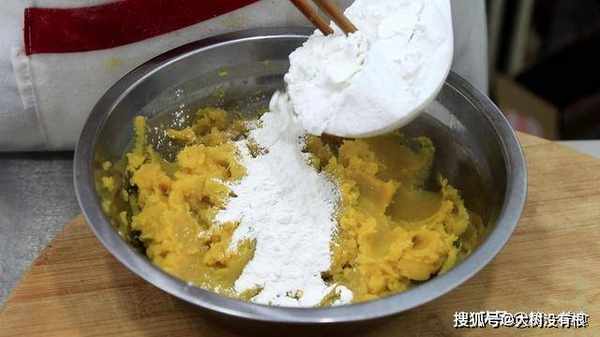用勺子 ,按压成红薯泥,加入糯米粉50克。
