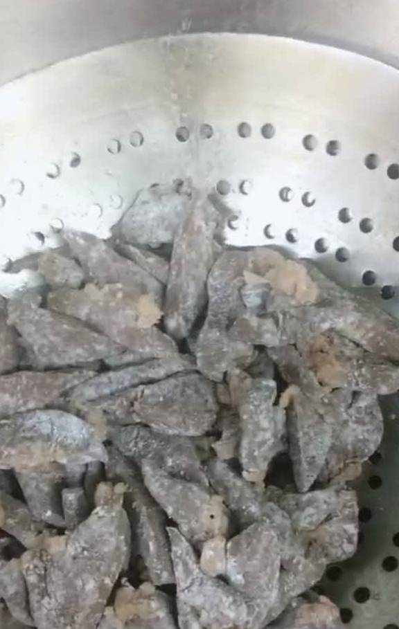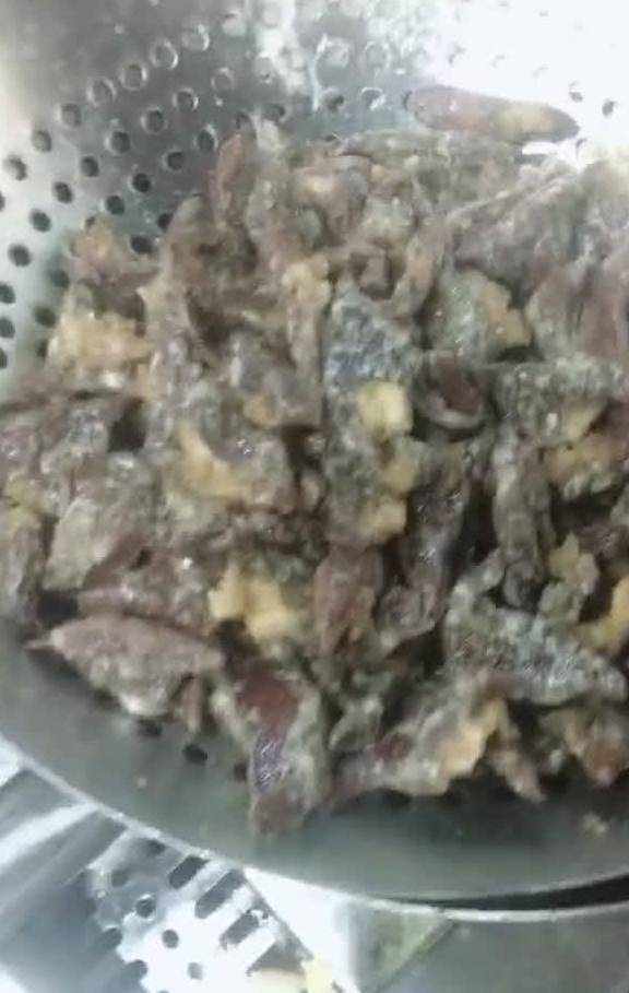稍微给它炸干点,如上图所示。此步骤为第三次去腥的操作步骤,既给沙肝过油,经过三次的加工,它已成了一道美味了。