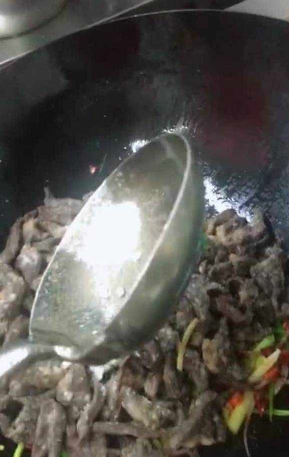 倒入辅料与炸制过的沙肝,开大火颠炒几下。