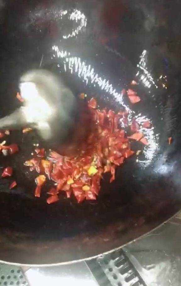 锅中放底油,放入干辣椒爆香,以出辣椒油为准。